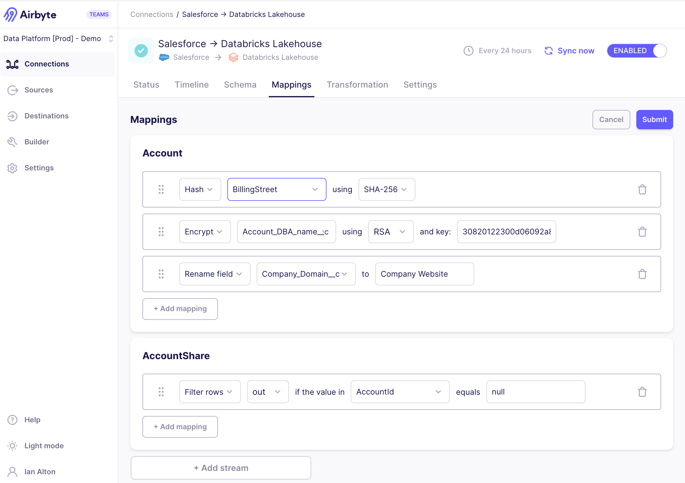 We introduced mappings in the API in version 1.3, and it's now available in Airbyte's user interface, too. Use mappings to hash, encrypt, and rename fields, and filter rows. You set up mappings on each stream, ensuring your source data arrives in your destination in a more meaningful way. Learn more >